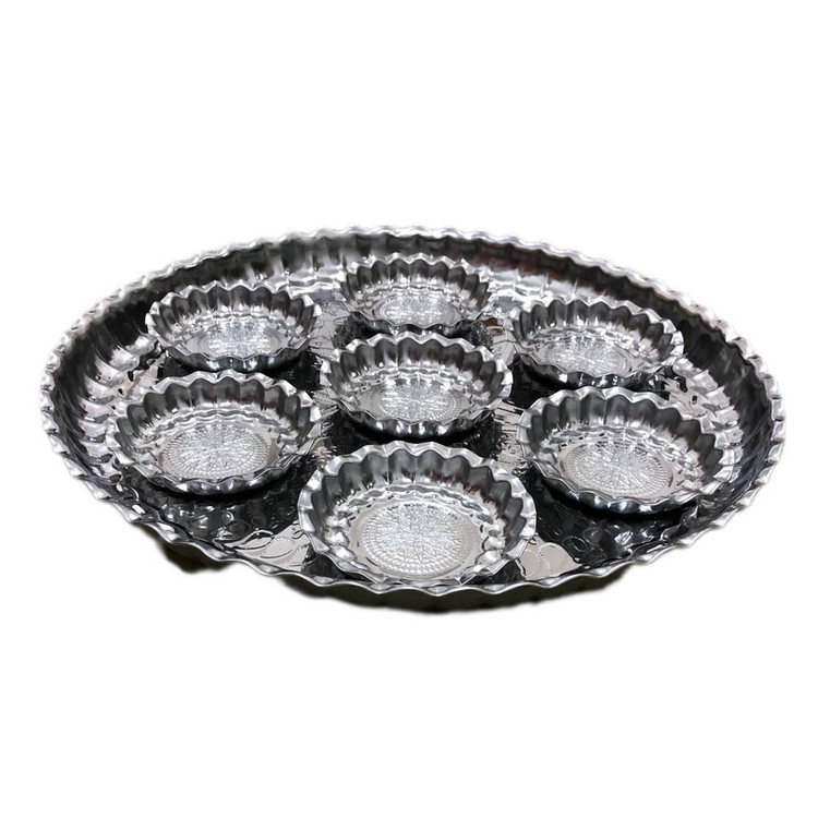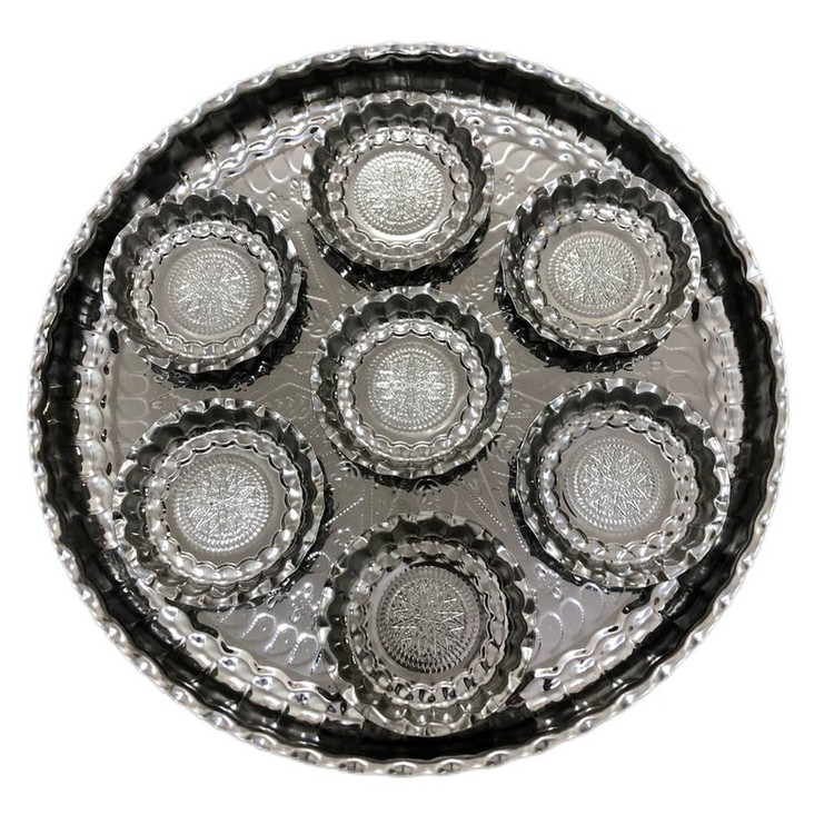 مجموعه هفت سین متشکل از 7 عدد سینی استیل طرح دار نقش برجسته به قطر 12 سانتی متر و 1 عدد سینی استیل طرح دار نقش برجسته به قطر 44 سانتی متر.